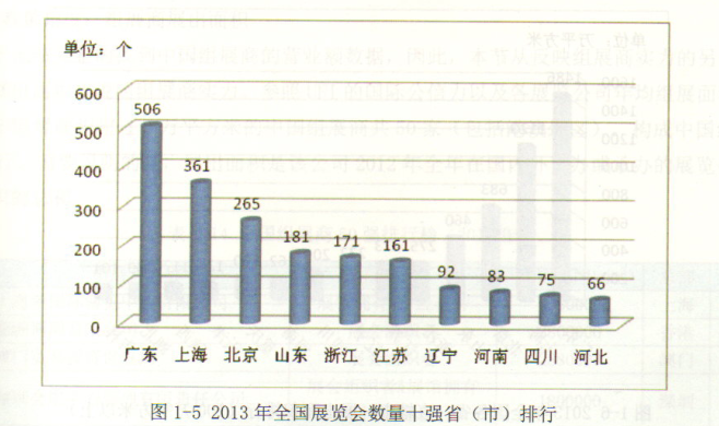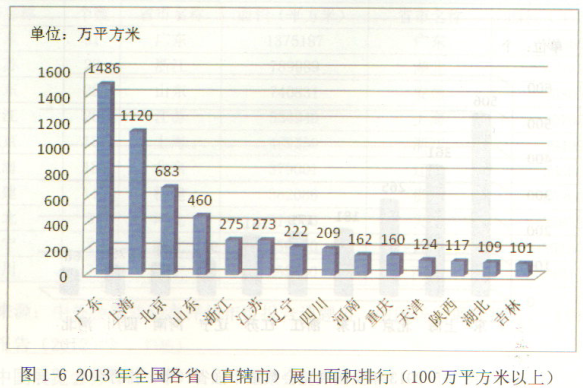 根據(jù)中國貿(mào)促會發(fā)布的《中國展覽經(jīng)濟(jì)報(bào)發(fā)展告(2013)》。展會數(shù)量方面,按?。ㄗ灾螀^(qū)、直轄市)分析,2013 全國展覽活動(dòng)按數(shù)量排列,前世的一次是:廣東506個(gè),上海361個(gè),北京265個(gè),山東181個(gè),浙江171個(gè),江蘇161個(gè),遼寧92個(gè),河南85個(gè),四川75個(gè),河北66個(gè)。這十個(gè)省(自治區(qū)、直轄市)的展覽總數(shù)量占全國總量的70%集聚了全國主要的展覽活動(dòng)。其中,廣東省展覽會舉辦數(shù)量位居全國第一,展出面積位居全國第一,同時(shí),在場均長出面積排名方面,廣東以2.21萬平方米、場位居全國第一,說明廣東省無論從展覽會整體規(guī)模、發(fā)展水平還是整體質(zhì)量上,都處于全國領(lǐng)先地位。