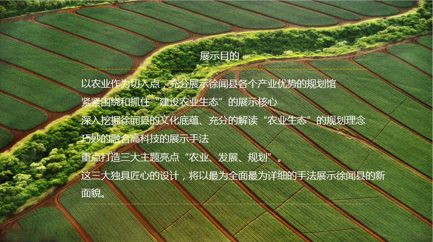 徐聞農(nóng)業(yè)科技展示中心——規(guī)劃館設(shè)計(jì)裝修,展示徐聞農(nóng)業(yè)發(fā)展史,規(guī)劃建設(shè)成果和未來(lái)農(nóng)業(yè)發(fā)展,此外,作為農(nóng)業(yè)知識(shí)、事情教育和規(guī)劃知識(shí)教育基地,起到推崇徐聞形象,對(duì)外招商引資的平臺(tái)。
